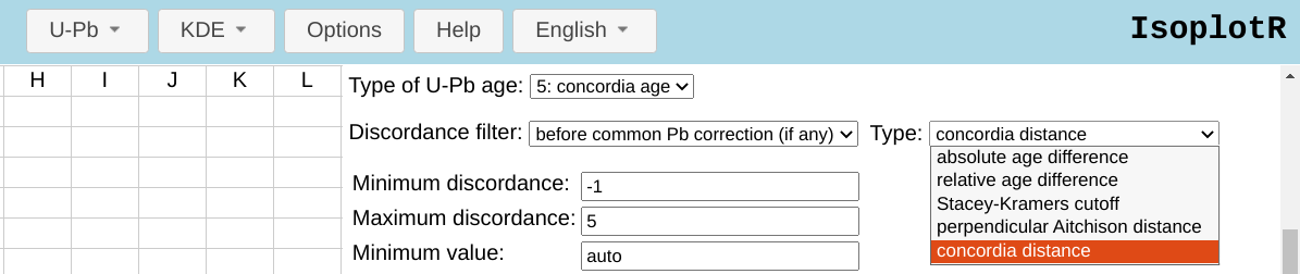IsoplotR can be accessed either from the command line, or via a graphical user interface (GUI), either offline or online (http://isoplotr.london-geochron.com). The discordance filters are accessible via both methods. In the GUI, the discordance can be tabulated via the Age function, and has also been incorporated in IsoplotR’s other functions, including its concordia, weighted mean and kernel density estimation algorithms. Further details are provided under the Options menu (Figure 9).