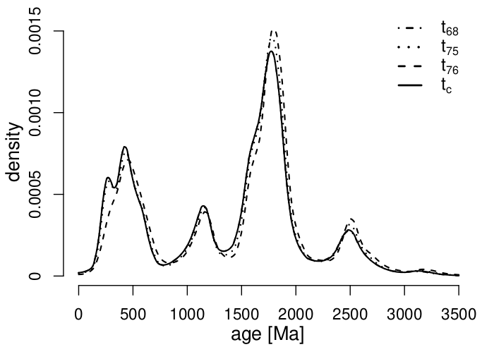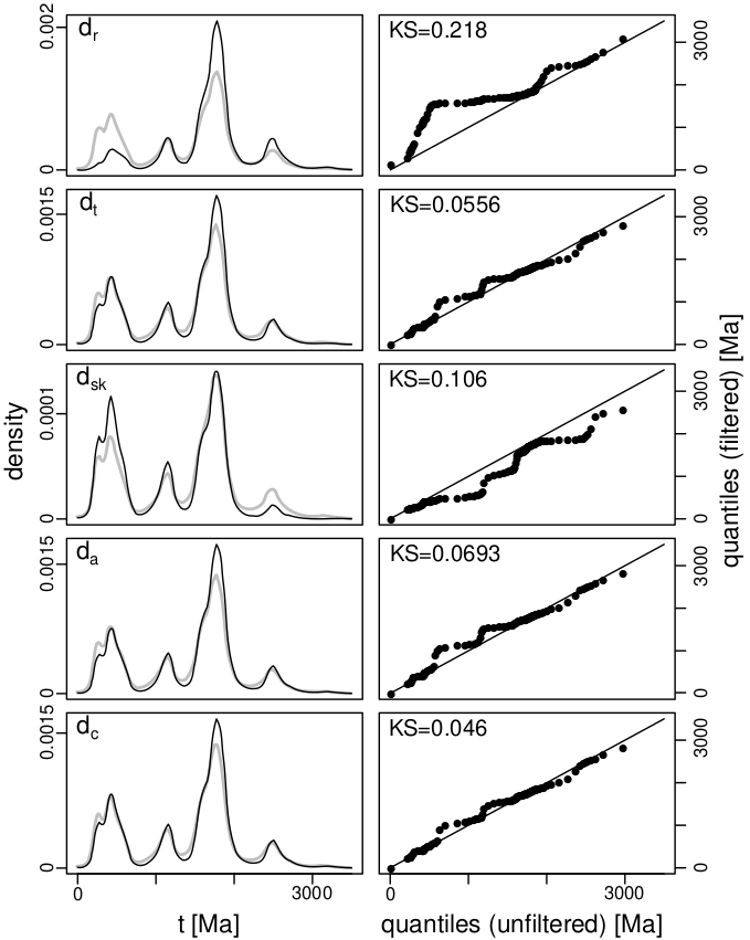 The discordance definitions based on the absolute age difference and logratio distances have a comparatively minor effect on the shape of the age spectrum. The change in shape between the age spectrum of the full (unfiltered) dataset and the age spectra of the filtered datasets can be visually assessed on quantile-quantile plots and quantified using the Kolmogorov-Smirnov (KS) statistic (Vermeesch, 2013). If the KS-misfit is taken as a measure of success, then the concordia distance filter (dc) is the most effective discordance criterion. It ‘sharpens’ the spectrum without changing the relative prominence of the modes at 400, 1200, 1800, and 2500 Ma.