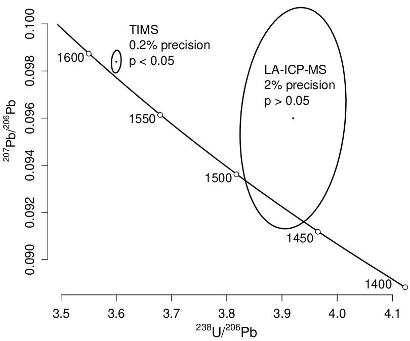 The p-value definition affects grains differently depending on their analytical precision (Nemchin and Cawood, 2005). For example, consider a 1.5 Ga zircon that is dr = 1% discordant. If this grain were analysed by LA-ICP-MS with an analytical precision of 2%, say, then it would pass the chi-square test and be accepted as being concordant. However, if that same grain were analysed by TIMS with a precision of 0.2%, then the p-value criterion would reject it as being discordant (Figure 4). It seems fundamentally wrong that an imprecise analytical method would be favoured over a precise one. This is a pertinent problem because technical innovations are increasing the precision of all analytical approaches to U–Pb geochronology. As precision improves, so does the ability to detect ever small degrees of discordance. Using the p-value criterion, there may come a time when no zircon passes this filter.