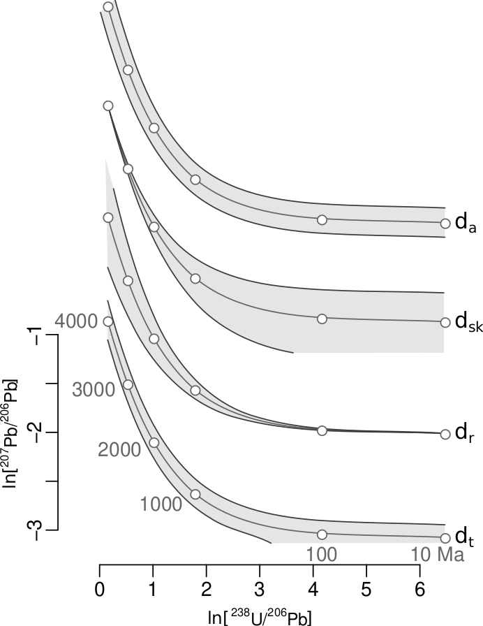 This definition produces a parallel band around the concordia line in logarithmic Tera-Wasserburg space. In contrast with dr, dt, dsk, the da criterion is less strict at both the young and old extremes of the geological timescale, and more strict during the Proterozoic Eon, when the U–Pb method is most reliable.