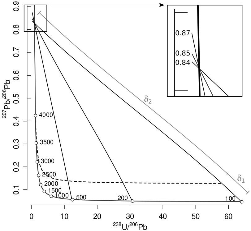 where r86* is the 238U/206Pb-ratio of the intersection between concordia and a straight line connecting the 238U/206Pb–207Pb/206Pb measurement to the inferred mantle composition (Figure 5).