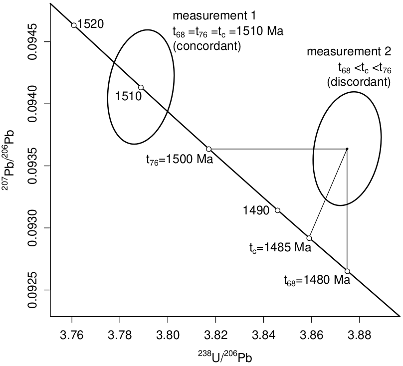 A second subjective decision is how to define the discordance cutoff between ‘good’ and ‘bad’ data. Discordance is usually defined as (1) the relative age difference between the 206Pb/238U and 207Pb/206Pb dates. However, this paper shows that several other definitions are possible as well, including (2) the absolute age difference; (3) the common-Pb fraction according to the Stacey-Kramers mantle evolution model; (4) the p-value of concordance; (5) the perpendicular logratio (or ‘Aitchison’) distance to the concordia line; and (6) the logratio distance to the maximum likelihood composition on the concordia line.