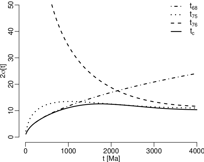 Both of these problems can be solved by using ‘hybrid’ concordia ages instead of ‘pure’ 206Pb/238U and 207Pb/206Pb ages. Concordia ages are defined by Ludwig (1998) as the ‘most likely’ (in a statistical sense) U–Pb age given the isotopic ratio composition and its analytical uncertainty (Figure 1). Let r86 and r76 be the measured 238U/206Pb and 207Pb/206Pb ratios, respectively; let σ[r86]2, σ[r76]2 and σ[r86,r76] be their (co)variances; and let R68(t) = exp(λ238t) - 1, R75(t) = exp(λ235t) - 1, and R58 = 235U/238U. Then the concordia age tc is obtained by numerically minimising the sum of squares S1: