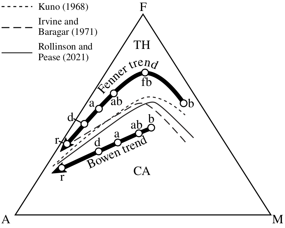 A case in point is the division of subalkaline igneous rocks into tholeiitic and calc-alkaline suites. This classification has its roots in the 1920s (Bowen, 1928; Fenner, 1929; Kennedy, 1933; Tilley, 1950) and is based on the empirical observation that, when plotting igneous rocks on an A–F–M diagram (where A = Na2O+K2O, F = FeOT, M = MgO, and A + F + M = 1), magmatic differentiation can produce a ‘Fenner trend’ (F/M ratio increases with increasing A) or a ‘Bowen trend’ (the F/M ratio remains more constant). The Fenner and Bowen trends characterise the tholeiitic and calc-alkaline suites, respectively.