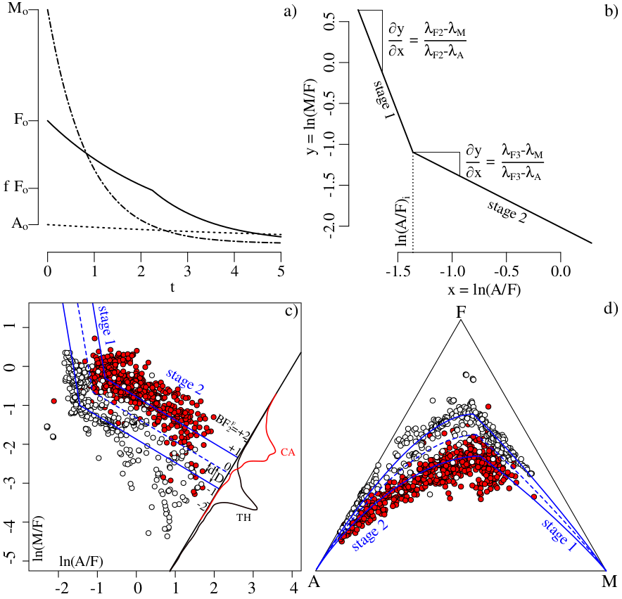 The two linear trends that constitute Equations 14 and 15 intersect at an acute angle (Figure 4a), as opposed to the obtuse angle of Figures 3b and c. This reflects the fact that λT < λA for the first stage and λT > λA for the second stage. In contrast, λF > λA in both stages of the A–F–M model (Figure 3a). Equations 14 and 15 can be used to define a two-stage Bowen-Fenner index (BF2T) in complete analogy with the BF2F-index of Equation 13. It is also possible to combine the two indices together to form an average ‘two-stage Bowen-Fenner index’: