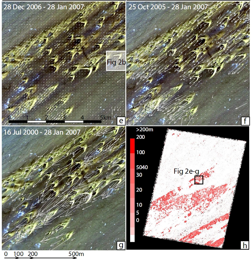 After the orthorectification and resampling step, the two images are fed into the correlation engine. Using a square sliding window, COSI-Corr employs a Fourier algorithm to calculate the relative N-S and E-W displacement fields by maximising their cross-correlation (Leprince et al., 2007). We used a variable window size of 64 to 32 pixels wide with a step size of two pixels. This causes the output resolution of the displacement field to be 30m, i.e. half of the ASTER VNIR system resolution, but identical to the DEMs generated by combining the satellite’s stereographic V3N-V3B pair. This common resolution facilitates the calculation of sand flux, as discussed below. The N-S and E-W displacement maps can be visualised as a vector field or converted to a Euclidean distance map (Figure 2.d). COSI-Corr successfully detects dune displacements of as little as 5 m over a period of only one month (Figure 2.e). The precision of the correlation is ± 3 m (1 σ), as determined from the residual displacement over stable ground. The signal-to-noise ratio (as defined by Leprince et al., 2007; Equation 43) of the displacement map improves over somewhat longer time scales of 15 months (2005-2007), but then decreases again for even longer time scales of 6.5 years (2000-2007; Figure 2.f,g). The reason for this is that dune shapes and patterns change over such time scales as small dunes overtake larger ones, are shed from them or absorbed by them, thus complicating the correlation process. Two image displacement maps can be directly compared on a pixel-by-pixel basis because they are projected onto a common reference frame. This reveals that dune celerities between December 2006 and January 2007 are 2.5 times faster than between October 2005 and January 2007, consistent with the higher wind speeds of the Bodélé ‘Low Level Jet’ during winter (Warren et al., 2007).