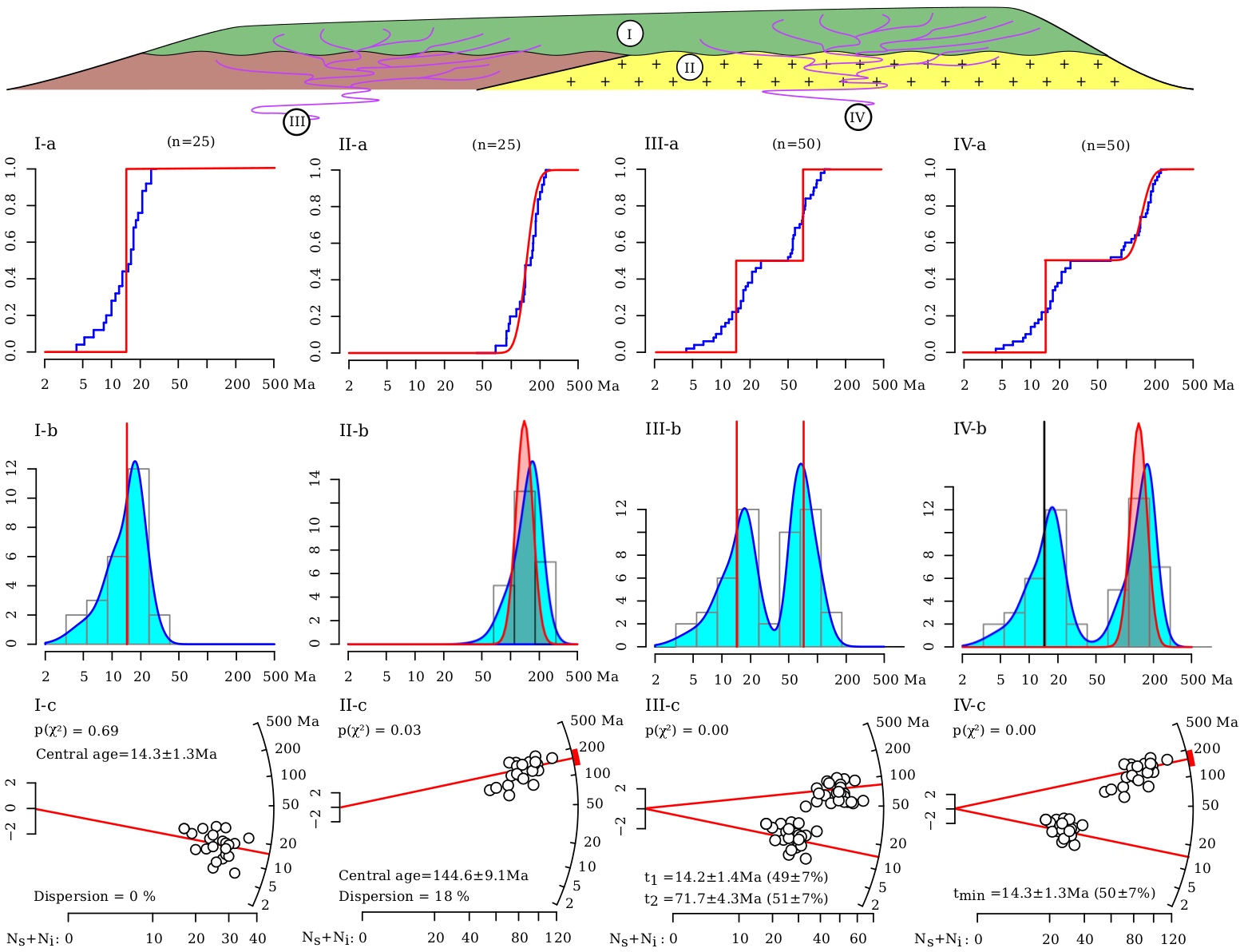 Under Scenario I, the pdf is a discrete peak of zero width and infinite height, marking the timing of the volcanic eruption (Fig. 6.2.I-b). In contrast, under Scenario II, the pdf is a smooth (a)symmetric bell curve reflecting the spread in closing temperatures and, hence, ages, associated with the range of Cl/F-ratios present in apatites of this slowly cooled pluton (Fig. 6.2.II-b). Under Scenario III, the pdf consists of two discrete spikes corresponding to the two volcanic events (Fig. 6.2.III-b). Finally, under Scenario IV, the pdf effectively combines those of Scenarios I and II (Fig. 6.2.IV-b). The pdfs, like the cdfs discussed before, are unknown but can be estimated from sample data. There are several ways to do this. Arguably the simplest of these is the histogram, in which the observations are grouped into a number of discrete bins. Kernel Density Estimates (KDEs) are a continuous alternative to the histogram, which are constructed by arranging the measurements from young to old along the time axis, adding a Gaussian ‘bell curve’ (or any other symmetric shape) on top of them, and then summing those to create one continuous curve (Silverman 1986, Vermeesch 2012). The standard deviation of the Gaussian ‘kernel’ is called the ‘bandwidth’ of the estimator and may be chosen through a host of different approaches, a proper discussion of which falls outside the scope of this review (Abramson 1982, Silverman 1986, Botev et al. 2010, Vermeesch 2012). An important feature of all these algorithms is that the bandwidth monotically decreases with increasing sample size. Please note that the so-called ‘Probability Density Plot’ (PDP, not to be confused with pdf!), in which the analytical uncertainty (or 0.6 times the analytical uncertainty, Brandon 1996) is used as a ‘bandwidth’ does not possess this feature. Therefore PDPs are not proper density estimates and consequently their use is not recommended (Galbraith 1998, Vermeesch 2012). Like the CAD, which is a smooth version of the cdf, KDEs (and histograms) are smooth versions of the pdf. But whereas the CAD has only been smoothed once, histograms and KDEs are smoothed twice, once by the analytical uncertainties, and once by the width of the bins or kernels. Because the analytical uncertainties of FT data are so big, the components of FT age distributions are often spread out very widely, resulting in poorly resolved KDEs (blue curves in Figs. 6.2.b).