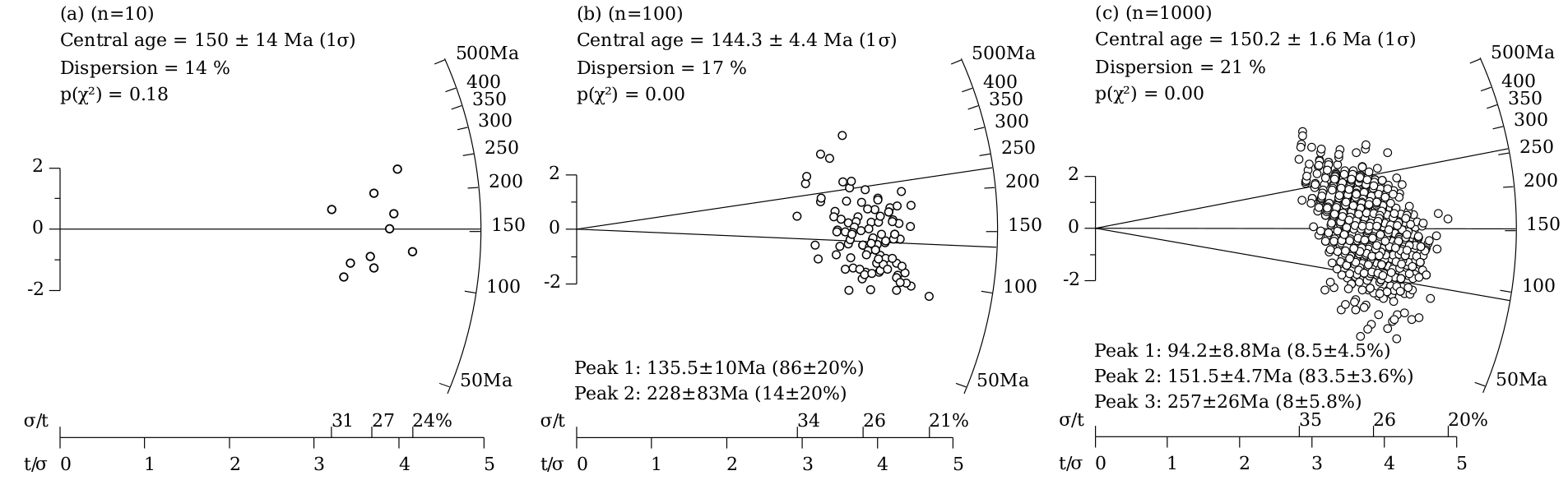 Single grain fission track age uncertainties are not only very large, they generally are also variable (‘heteroscedastic’). Due to a combination of Poisson sampling statistics and variable U-concentrations, the analytical uncertainties propagated using Eq. 6.8 may vary over an order of magnitude within the same sample. Neither CADs nor KDEs (let alone PDPs) are able to capture this uncertainty. The radial plot is a graphical device that was specifically designed to address this issue (Galbraith 1988, 1990, Dunkl 2002, Vermeesch 2009). Given j=1...n numerical values zj and their analytical uncertainties σj, the radial plot is a bivariate (xj,yj) scatterplot setting out a standardised estimate (yj = (zj -z∘)∕σj, where z∘ is some reference value) against the single grain precision (xj = 1/σj). For FT data using the EDM3, it is convenient to use the following definitions for zj and σj (Galbraith 1990):