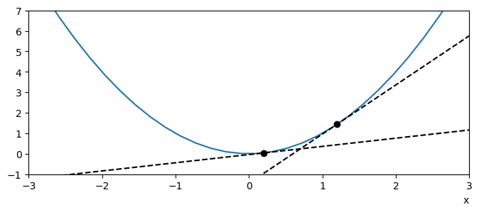 Fig. 3.1 \(y=x^2\) and its tangent at \(x=0.2,\ 1.2\)#
