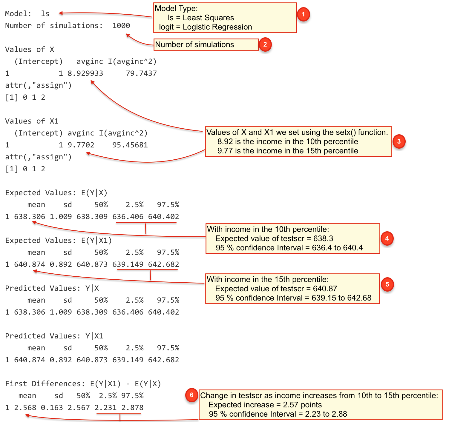 The values we set for x and x1 arguments when calling the setx() function of Zelig. Since we're interested in the effect of income from the 10th percentile to the 15th percentile, we first calculate those using the quantile() function and obtain 8.92 and 9.77 respectively. |