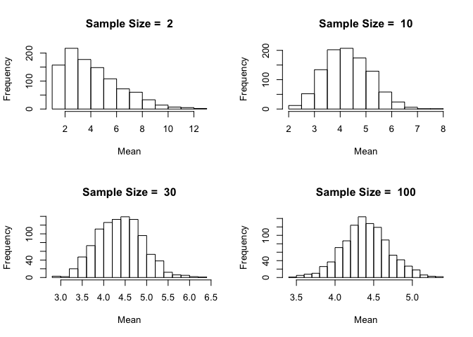 hist(sample_mean, breaks = max(dataset), main = paste("Sample Size = ", sample_size), xlab = "Mean")