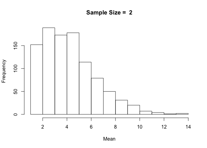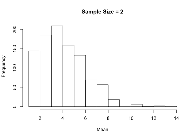 hist(sample_means, breaks = num_breaks, main = "Sample Size = 2", xlab = "Mean")