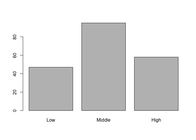 Let's move on to some visualizations starting with a bar chart of socioeconomic status and let's take advantage of the factor variable we created above. Since socioeconomic_status is a factor variable, R automatically knows how to draw bars for each factor and label them accordingly.