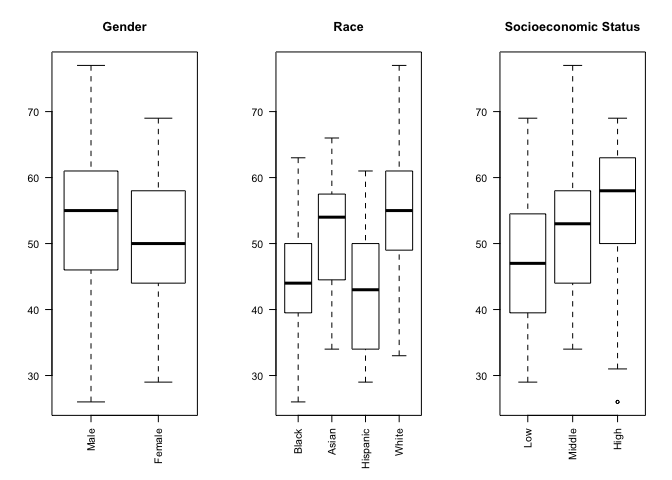 We can make our chart even more informative by comparing the science score based on gender, race and socioeconomic status in a single figure with side-by-side sub-plots for each variable. In order to accomplish that, we use the par() function to change graphical parameters and instruct R to create a figure with 1 row and 3 columns using the mfrow=c(1,3) option. Once the graphical parameters are set, the three plots for gender, race and socioeconomic status variables will be created side-by-side in a single figure.
