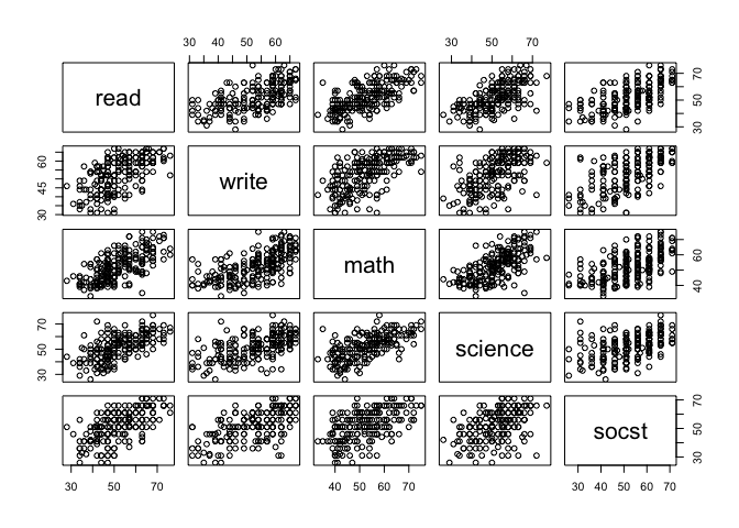 pairs(~ read + write + math + science + socst, data = student_data)