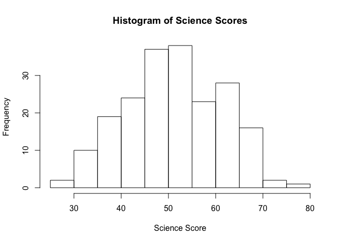 hist(student_data$science, main = "Histogram of Science Scores", xlab = "Science Score")