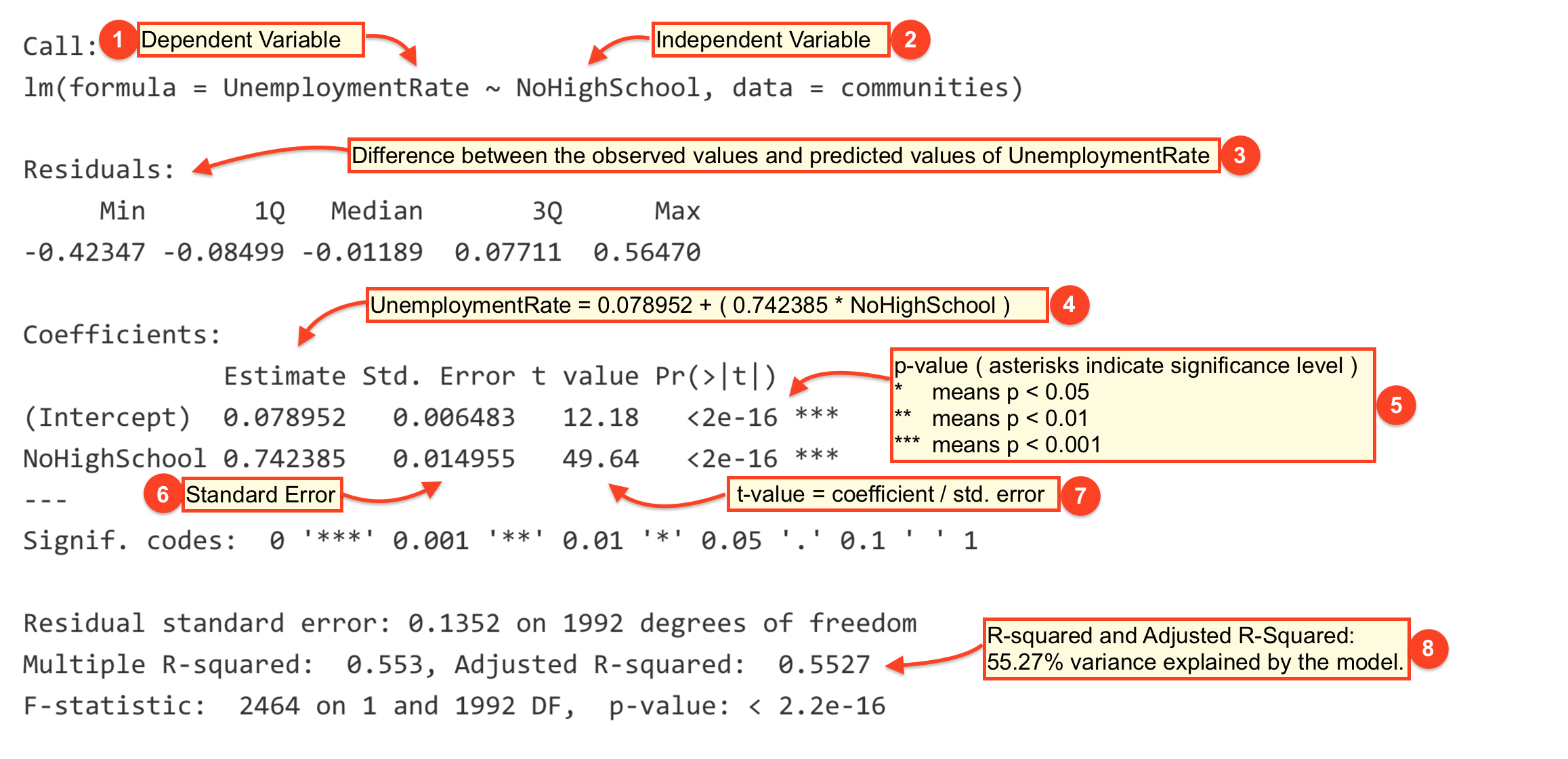 The coefficients for the intercept and the independent variables. Using the coefficients we can write down the relationship between the dependent and the independent variables as: UnemploymentRate = 0.078952 + ( 0.7423853 * NoHighSchool )This tells us that for each unit increase in the variable NoHighSchool, the UnemploymentRate increases by 0.7423853. |