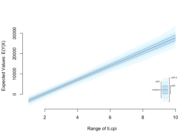 We do this using zelig(). First, we estimate a linear model. Then we check the range of ti.cpi which varies roughly from 1 to 10. Then we set our covariates. And vary ti.cpi from 1 to 10. Next, we simulate using our model and the covariates and finally plot our predictions.