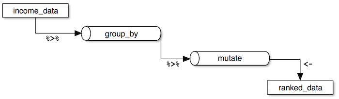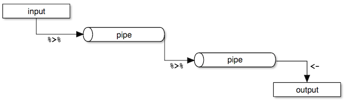 Dplyr makes it easy to "chain" functions together using the pipe operator %>%. The following diagram illustrates the general concept of pipes where data flows from one pipe to another until all the processing is completed.