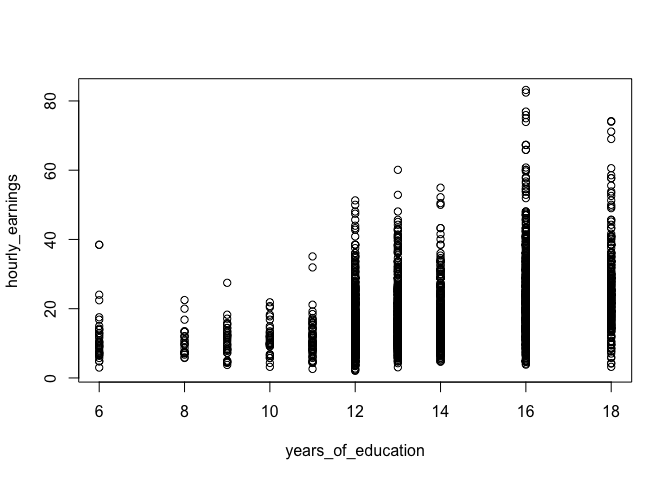 plot(hourly_earnings ~ years_of_education, data = income_data)