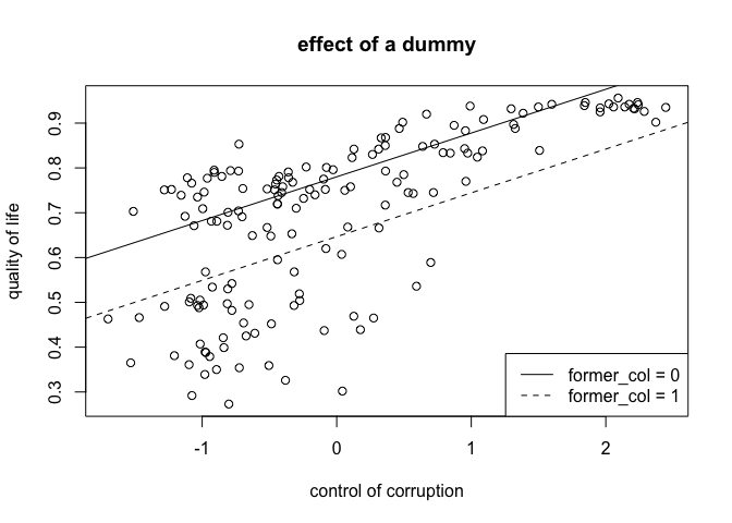 | 0 (not a former colony) | intercept + dummy coefficient * 0 | coefficient of control of corruption |