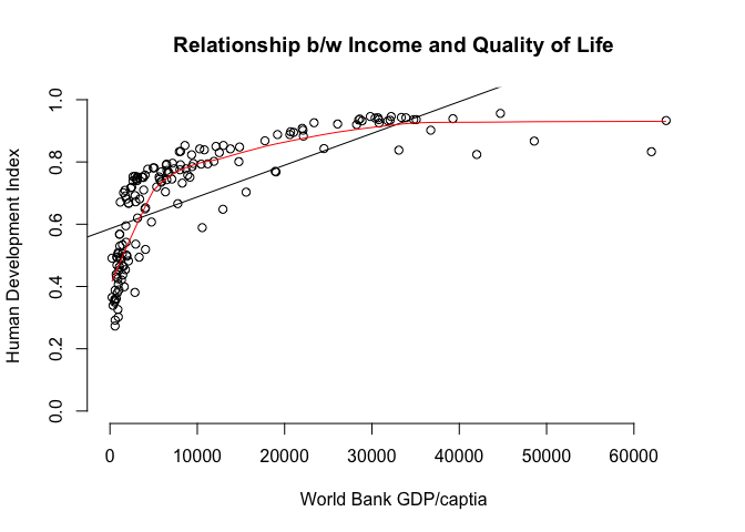 When looking at the scatter plot, we clearly see a non-linear relationship between the x-variable (GDP/captia) and the y-variable (quality of life.). We fit a linear line through the point cloud using abline(). You see that points below $5000 and above $35,000 are below the line while points in between are above the line. This goes along well with our intuition. Additional wealth has a large effect on the quality of life in a poor country while the effect becomes smaller and smaller when higher levels of wealth are reached. That, however, implies that the slope of our line (the effect of the independent variable) should depend on the level of the independent variable.