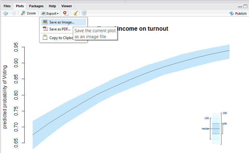 CivicDutyScores) and party identification (PartyID). Show and discuss descriptive statistics of the variables in a meaningful way. E.g.: what does a unit change in a variable mean, are variables comparable. Do this for all variables but concentrate your discussion on the interesting ones.Saving an R plot is easy. In the plot window, you click on export and then you just choose the file format you want ("png" or "pdf" will work best).