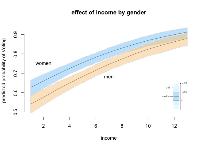 For the average woman (in our sample) with 18 years of education, we predict a probability of 84% that she will vote. Our uncertainty is plus and minus 4% on the 95% confidence level. For her male counterpart, we predict the probability of turnout to be 78% (plus and minus 5% based on the 95% confidence interval). Is the difference between them statistically significant or put differently is our hypothetical woman more likely to vote than our hypothetical man?