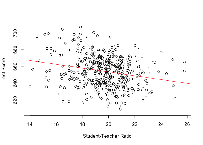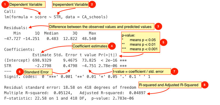 The coefficients for the intercept and the independent variables. Using the coefficients we can write down the relationship between the dependent and the independent variables as: score = 698.9329493 + ( -2.2798081 * STR ) This tells us that for each unit increase in the variable STR, the score increases by -2.2798081. |