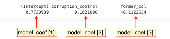 | 1 = former colony | Intercept + (former_col * 1)= 0.77 + (-0.11 * 1) = 0.66 |