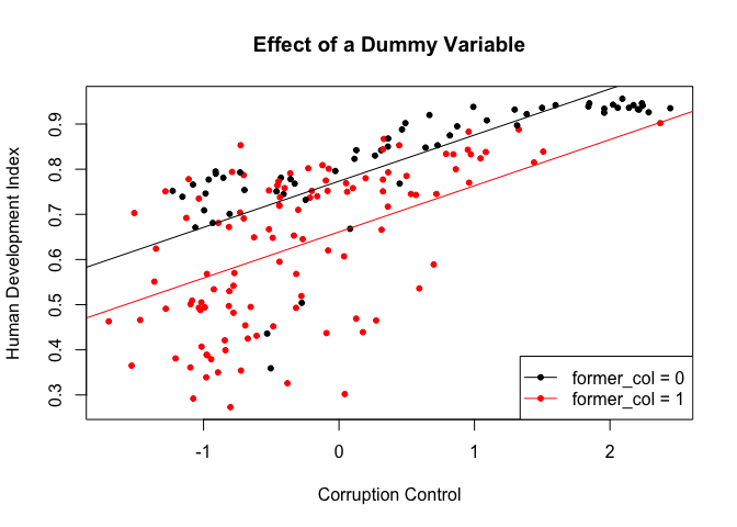 To illustrate the effect of a dummy we draw a scatterplot and then use abline() to draw two regression lines, one with former_col = 0 and another with former_col = 1.