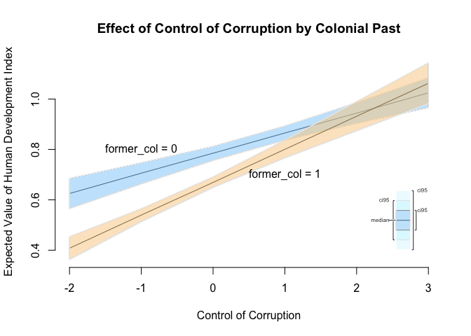 z.out <- zelig(hdi ~ corruption_control + former_col + corruption_control:former_col,