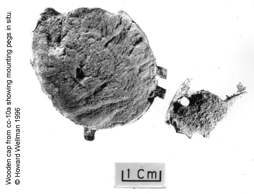 Figure 8: Wooden cap from CC-10a, showing mounting pegs in situ (50K)