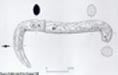 Some of the remains found on site include post alignments and other wooden structures, a skeleton of a child, antler artefacts and several copper alloy objects, including the sickle. The latter finds and the post alignments have suggested to some a comparison with the site of Flag Fen in Cambridgeshire, according to M. Taylor, an independent wood specialist (personal communication). Together with the other copper alloy objects, the sickle was recorded to have lain horizontally in the acidic peat. The pottery from the site gives a date around 800-600 BC, which is Late Bronze Age or Early Iron Age. Figure 1: Line drawing of the hafted sickle by Jane Russell. (109K)