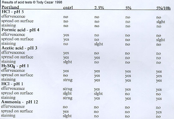 Table 1: Results of the acid tests on Portland treated for five hours with 2.5% and 5% solution and one treated for ten hours in a 5% solution of ammonium oxalate.