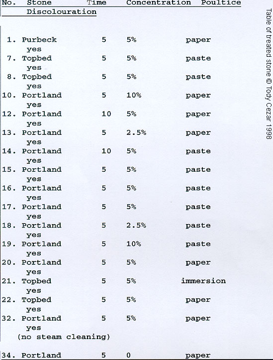 Appendix 1: Table of treated stone.