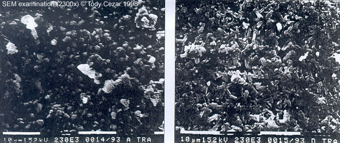 Figure 2: SEM examination (2300x magnification) shows significant crystal modification between (a) untreated and (b) treated samples. The rounded CaCo3 crystals become extended as a result of the treatment with ammonium oxalate.