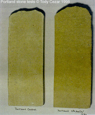 Figure 3: Portland stones (left) the control and (right) treated with a 5% solution of ammonium oxalate in paper pulp poultice paste for five hours.