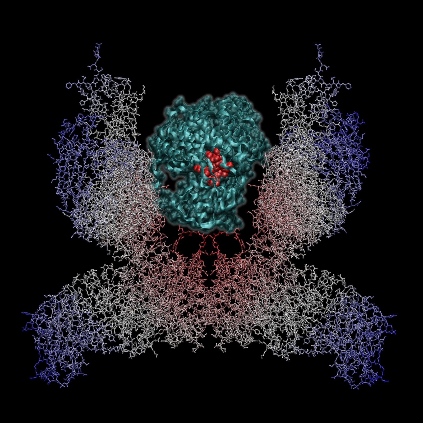 Transcobalamin II protein (teal) bound to cyanobalamin (red) sittin in the extracellular region of the insulin receptor