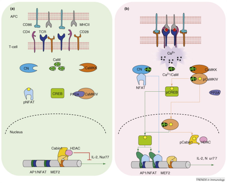 HDAC are class II histone deacetylases that removes acetyl groups on specific regions of the DNA-bound histone to increase its positive charge [6]. The modified histone consequently undergoes higher-affinity binding with the negatively charged DNA to bring about DNA condensation thereby preventing transcription. In contrast, CABIN-1 binds specifically to activated calcineurin to inhibit calcineurin-mediated signal transduction. Both DNA decondensation and calcineurin re-activation are absolutely required for relieving IL-2 repression and promoting IL-2 gene expression in active T-cells. Activation of the CaMKIV cascade, a transient process that is highly regulated by intracellular calcium concentrations, is predominantly associated with relieving IL-2 repression.