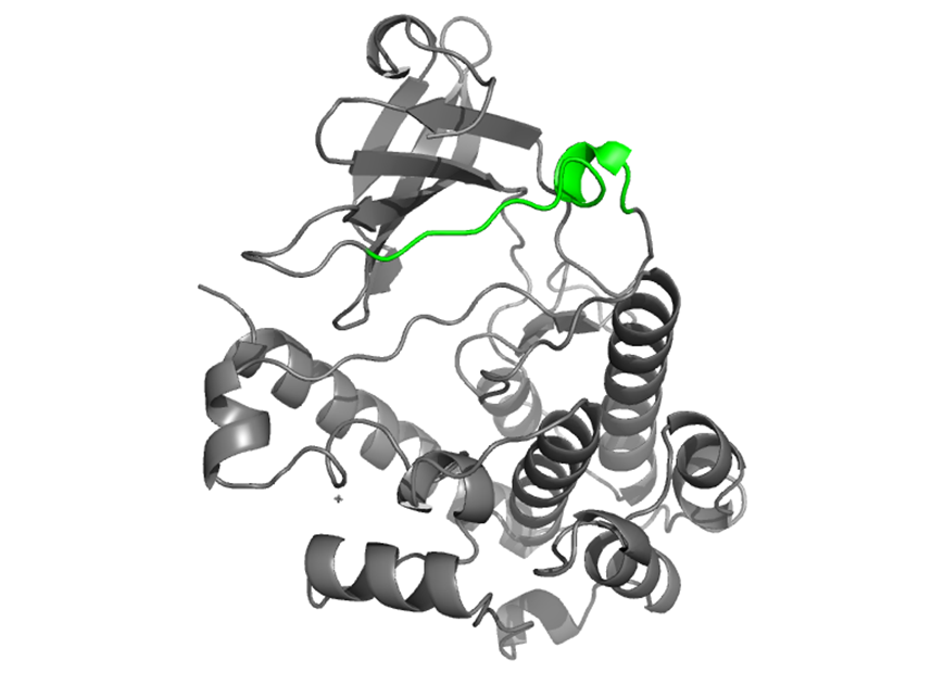 The activation loops of CaMKIV are located within the catalytic domain and are shown here in olive green. In its active state, the activation loop adopts an extended conformation that sprawls laterally away from the active site along the N lobe before redirecting back to the active site at the C lobe. Right orientation of this loop plays an important role in orientating the peptide substrate for phosphotransfer through H bonds. Thr 200, regulatory residue, is autophosphorylated upon activation. In its inactive state, the loop is really mobile, mostly due to the lack of ATP in the catalytic site, which promotes locking of the loop in its active sate. This mobility of the loop in is reflected in the X-ray crystallography since the loops are invisible in the structure found on PDB but are seen in this picture since a modelling program has been used (SwissModel). |