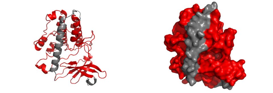 The entire catalytic domain of CaMKIV is displayed in the diagram above, represented by the red highlighted structures. Upon closer inspection, it is evident that the catalytic domain is infact subdivided into many smaller structures. A breakdown of these structures is displayed below, which includes ATP binding residues, C-helix, Cataltic loop, Activation loop and Substrate binding residues. Each of these domains play a critical role in the behaviour of CaMKIV following different signal stimulus, and collectively, they allow for the correct and regulated function of CaMKIV in the CaMKIV PATHWAY. |