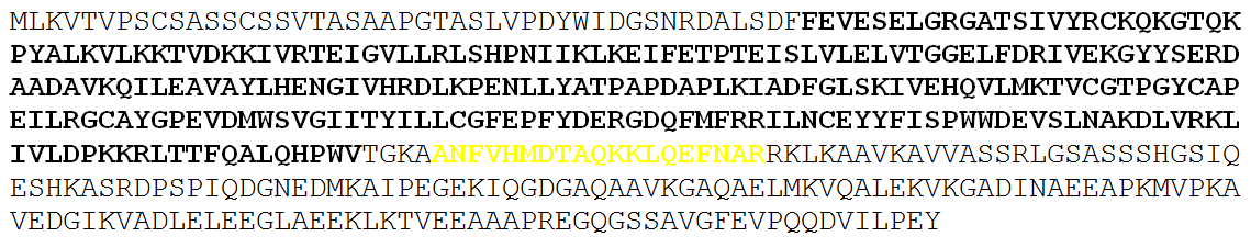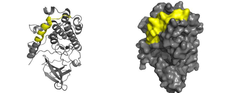 The PP2A binding domain (yellow highlight) is found at the C-terminal helix of the predicted model and is overlapping with the autoinhibitory domain. This domain is crucial for the regulation of CaMKIV activity. Physical association between the PP2A binding domain and PP2A is responsible for the inactivation of CaMKIV (which is achieved through dephosphorylation of the autophosphorylated residues at Thr200 in the active site of CaMKIV) and the maintainence of inactivated CaMKIV in its inactive state. In its inactive state the PP2A domain acts as a part of the active site-blocking helix. Upon activation, this domain moves into a new position to allow ATP and substrate peptide to bind to their respective targets within CaMKIV. |