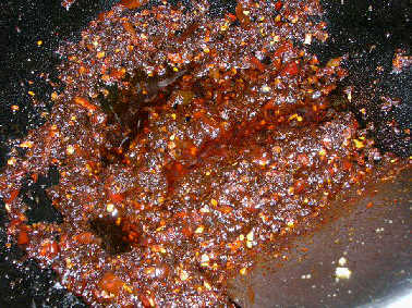 cornflour solution when it boiled, sprinkle the red chili oil in