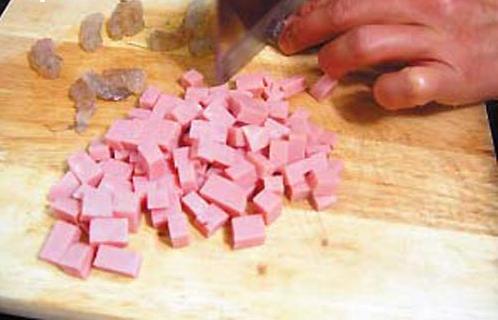 Soak dry dark mushrooms, shred into small dices, shred ham in same size