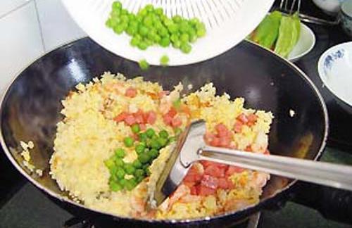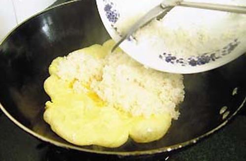 Add rice into the pan, continue to try with the egg with middle heat